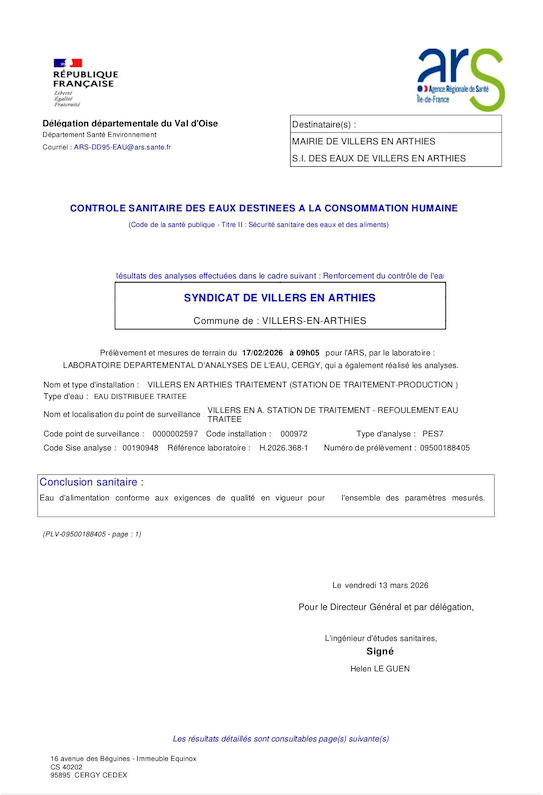 Le SIEV - Syndicat Intercommunal des Eaux de Villers - a reçu les derniers résultats du contrôle...